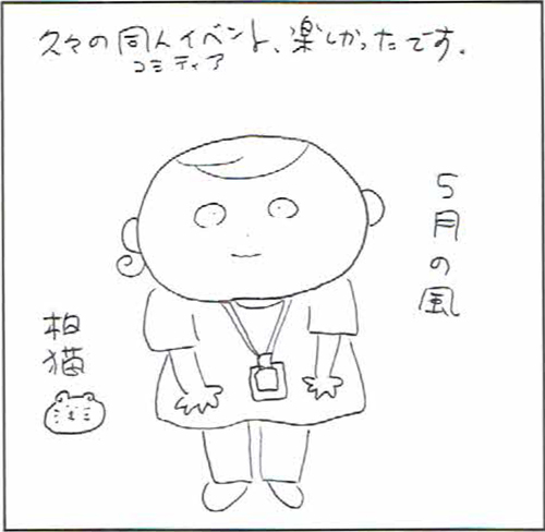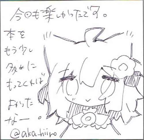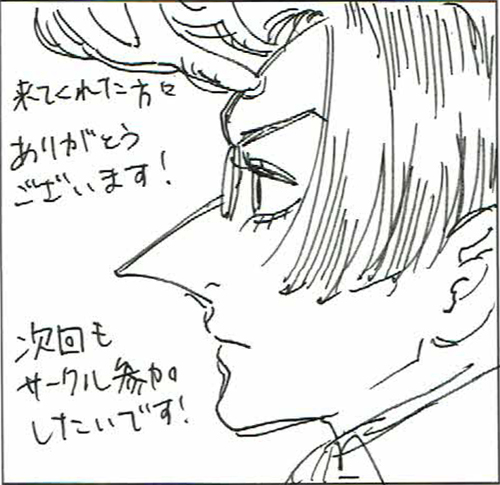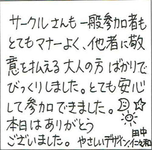 本日は、スペースをいただき、本当にありがとうございました。サークル参加の方も一般参加の方も、マナーがきちんとされている。ちゃんと他の人に敬意を払える大人の方が参加されている印象です。若くても年齢が高くても。とてもすばらしいと思います。