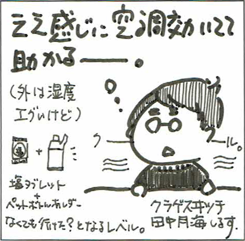 ・とくに何もしていないが、家ではエアコン代をケチるために扇風機を2つまわした部屋で作業をしていました。