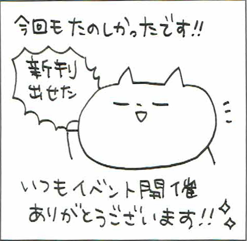 今回もイベントの開催ありがとうございました! 同人誌の価格にけっこうバラつきがあるのかなと思いました。自分は¥200~500くらいですが、他サークルさんは大体¥700~1000くらいが多かったので、色々と考えるきっかけになりました。